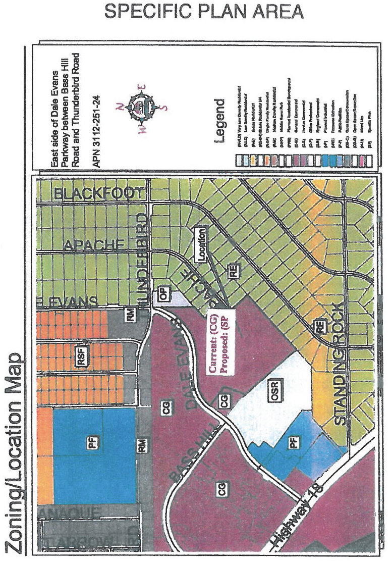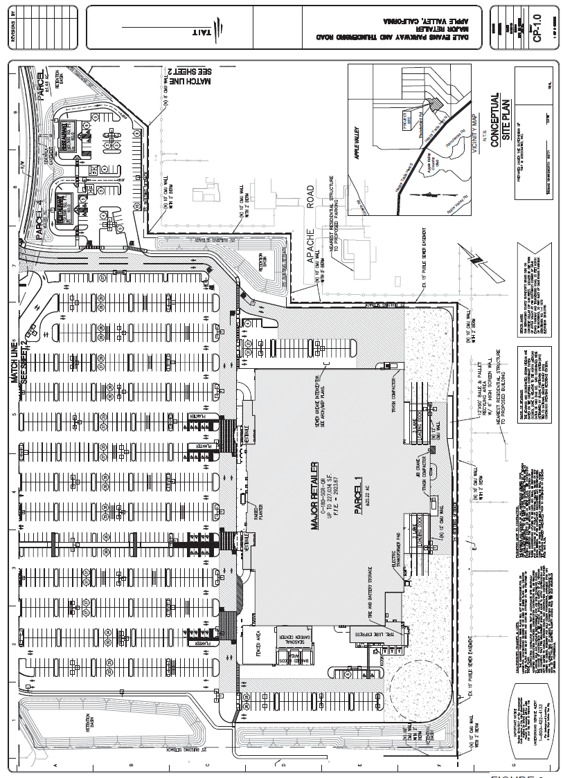 The Specific Plan area is adjacent to an established single-family residential neighborhood that is located to the northeast and southeast of the subject site within the Estate Residential (R-E) zoning designation. The property to the south is within the Open Space Recreational (OS-R) zoning designation and is developed with the Civic Center Park and Aquatics Center. The zoning designation to the west, across Dale Evans Parkway, is General Commercial (C-G) and contains the Apple Valley Commons retail center, which includes a Super Target and other retailers, services and fast food restaurants. The former Lowe's Home Improvement center is located north of the Super Target. The Specific Plan area has approximately 1,850 feet of street frontage along Dale Evans Parkway.