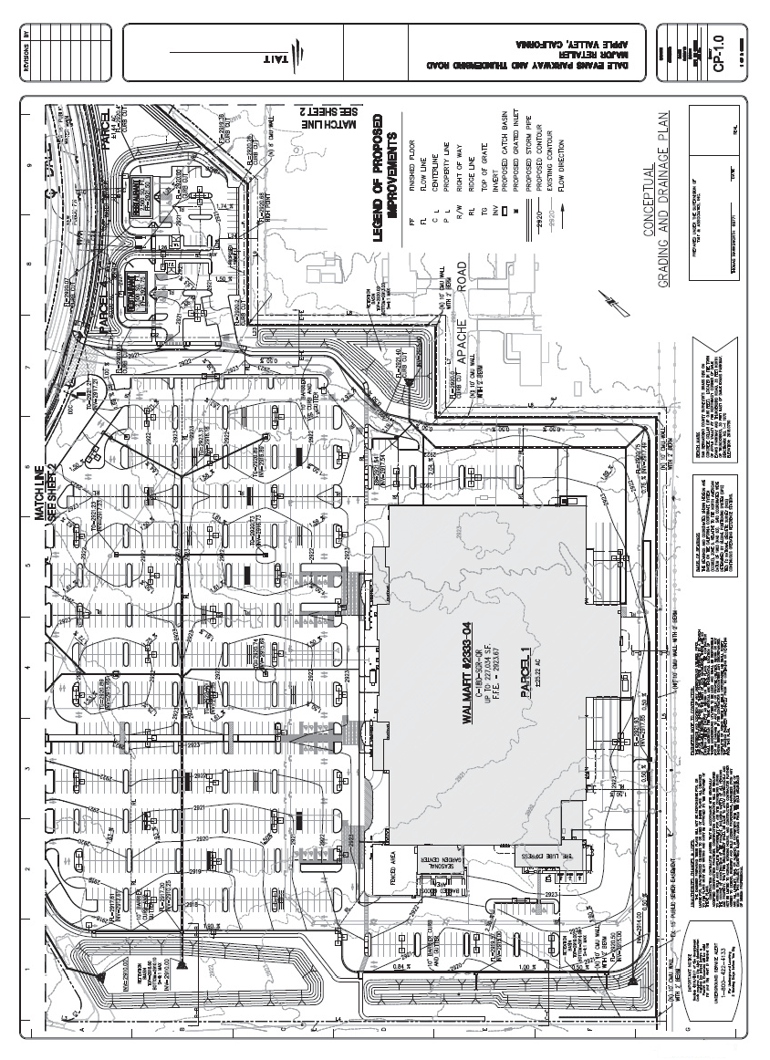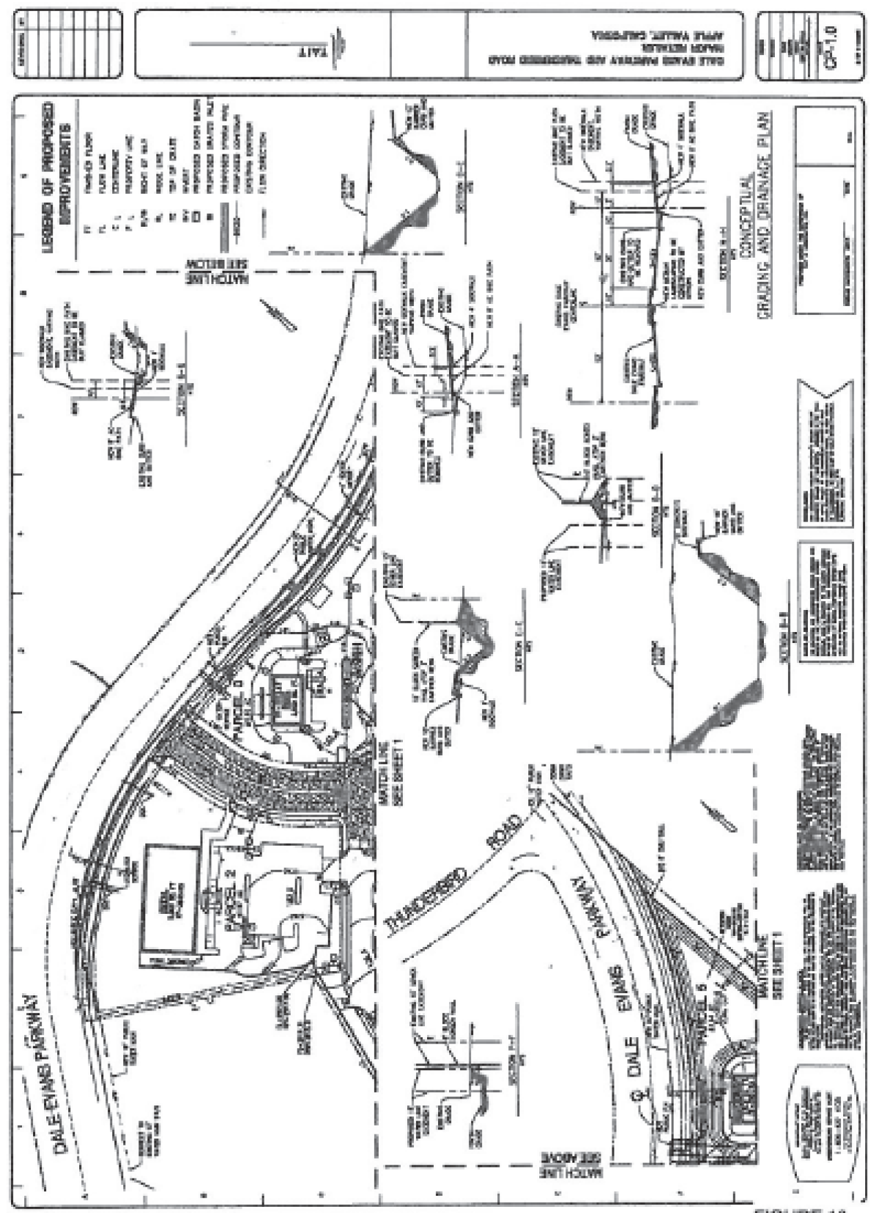 The topography of the Specific Plan area results in an overland flow with an ultimate discharge onto Dale Evans Parkway. The Specific Plan area also collects approximately 2.60-acres of runoff from a portion of Dale Evans Parkway. The Specific Plan area will utilize a combination of four surface basins to retain and infiltrate the runoff generated by the 100-year 24-hour storm event, as shown on Figures 9 and 10, and subject to the following requirements: