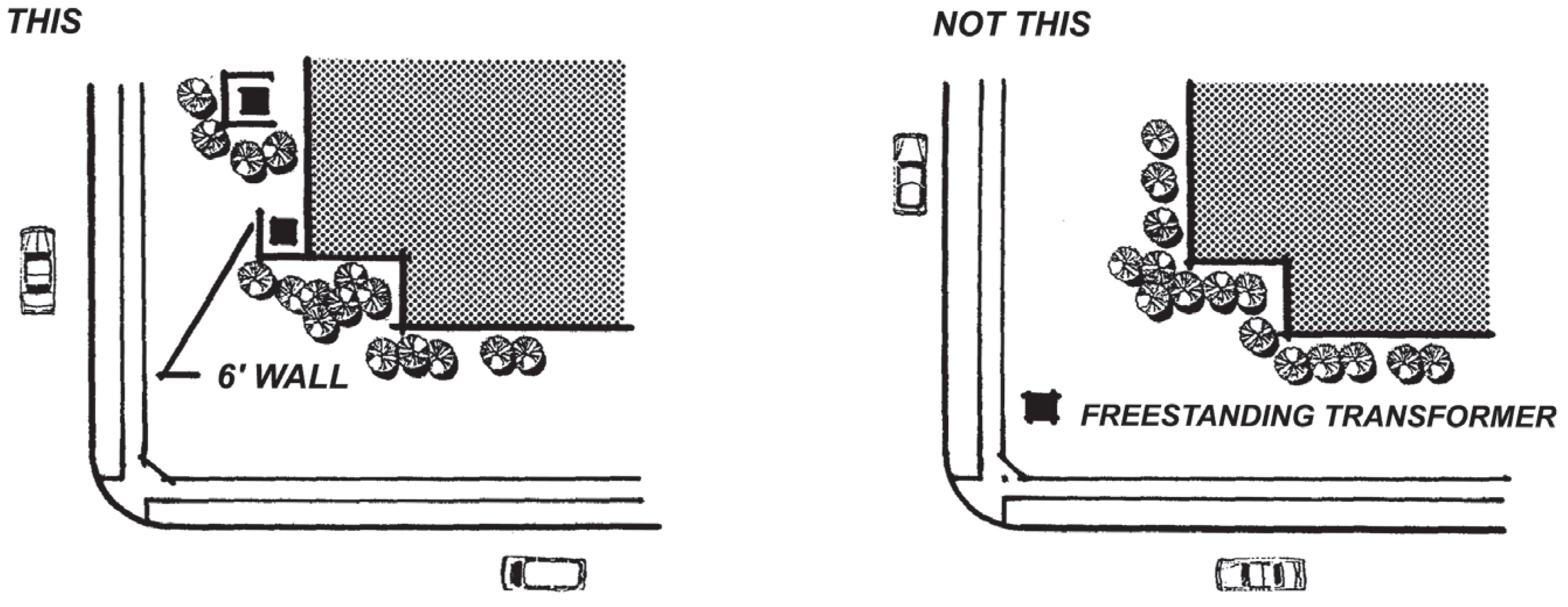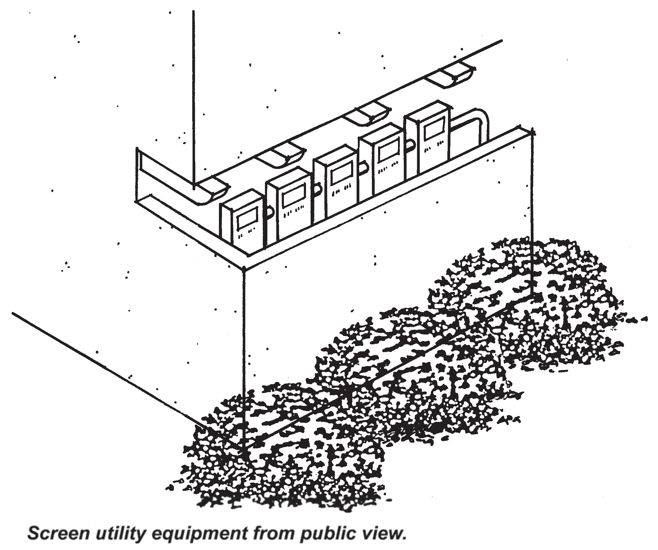 All utility connections shall be designed to co-ordinate with the architectural elements of the site so as not to be ex-posed except where necessary. Pad-mounted transformers and/or meter box locations shall be included in the site plan with any appropriate screening treatment (Figures 9.45.040-A and B).