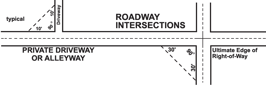 On corner lots, no man-made visual obstructions may be erected, placed, planted or allowed to grow within the Clear Sight Triangle to a height in excess of thirty (30) inches above the nearest street elevation. The Clear Sight Triangle is defined as the area within the triangle formed by connecting the points thirty (30) feet (10 feet at driveways) from the intersection of the two right-of-way lines. Trees within the Clear Sight Triangle shall be trimmed (to the trunk) to a line at least six (6) feet above the nearest street elevation (see Figure 9.45.060-A).