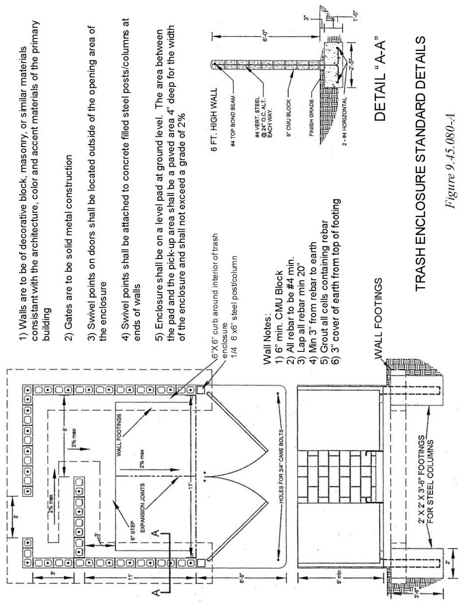 Trash/recycling material enclosures shall be provided in conformance with Figures 9.45.080-A & B as necessary to serve the development project. Businesses that generate four (4) cubic yards of solid waste per week, recycle bins shall be provided. In addition, the standards cited below shall apply.