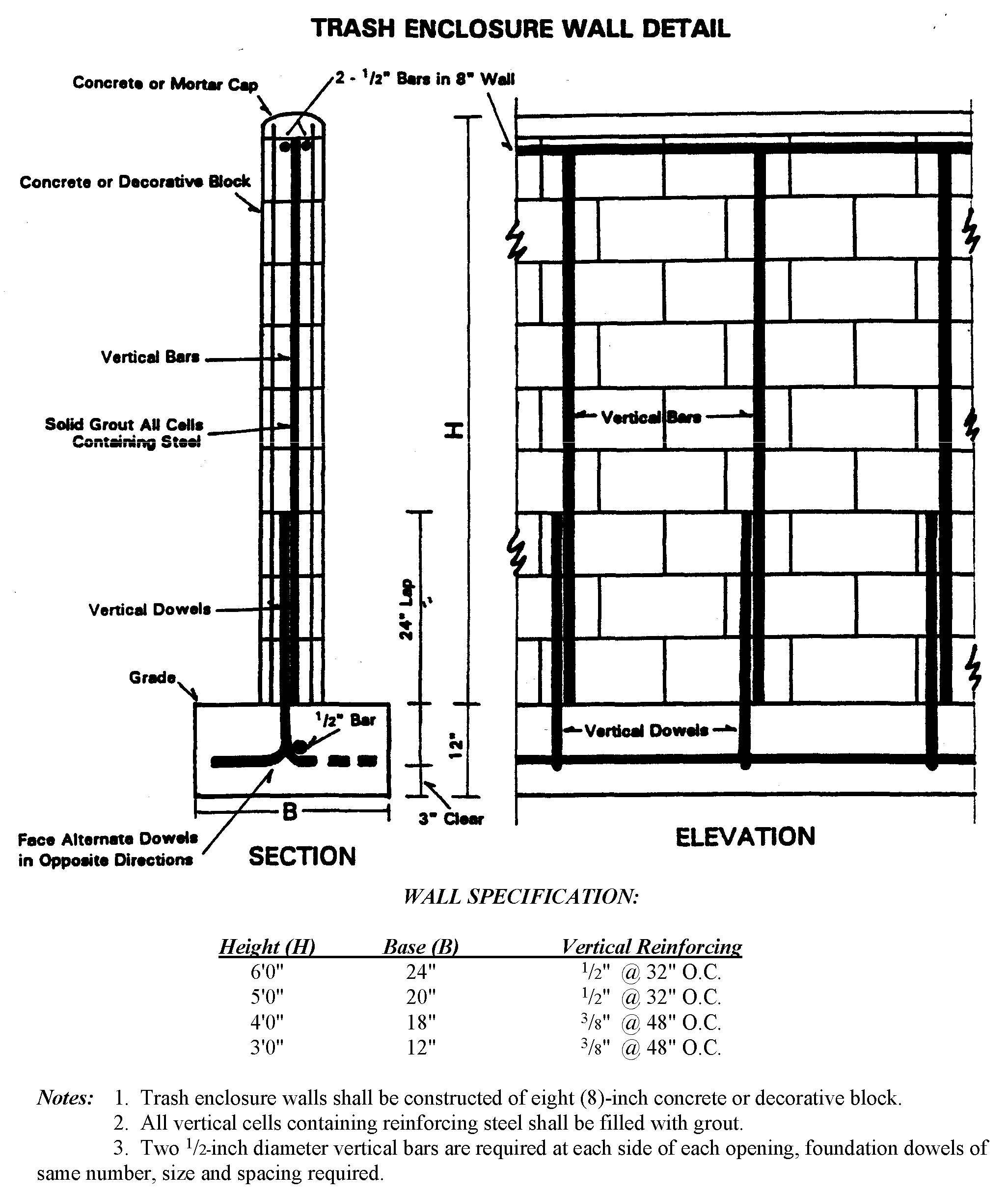 Screening of Trash Storage Areas. All outdoor storage of trash, garbage, refuse, and other items or material intended for discarding or collection shall be screened from public view on three sides by a six (6)-foot high wall of eight (8)-inch block construction. The fourth side shall be an opaque gate six (6) feet in height made of wood or metal. Gates of trash enclosures shall remain closed at all times except when the enclosure is being accessed for refuse disposal or pick up.