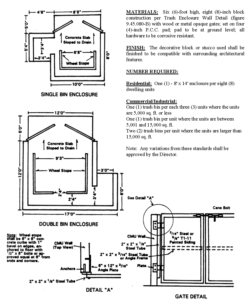 Size of Trash Enclosures. Trash receptacles for industrial district uses shall be of sufficient size to accommodate the trash generated by the uses being served, consistent with the Town trash enclosure standards (see Figures 9.46.080-A and B), providing a minimum of: