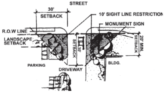 Driveways perpendicular to street shall have triangular shaped extended/landscape areas, with one side running along the driveway and one side running along the street right-of way each measuring 30 feet. This will create areas for enhanced landscaping and monument signs, however, the clear sight triangle provisions of paragraph 9.47.040.A.1 shall be observed (Figure 9.47.050-B).