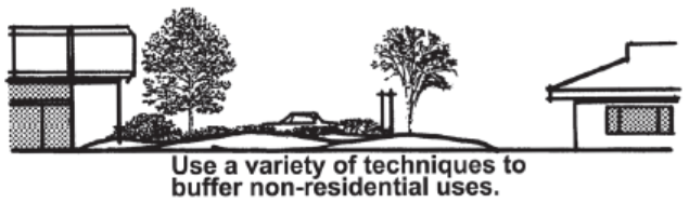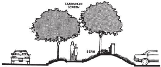 Landscaping, earth berms, decorative walls and other buffers shall be used to define project boundaries and to reduce impacts on adjacent properties (Figure 9.47.060-A).
