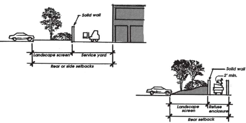 Accessory structures and service areas such as trash enclosures or loading areas shall be screened from public streets and adjacent properties through a combination of landscaping and walls (Figure 9.47.060-C).