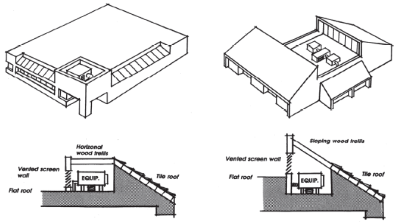 All outdoor mechanical and electrical equipment, whether rooftop, side of structure, or on the ground, shall be screened from view from the public street by architectural elements designed to be an integral part of the building. Plans submitted shall include the locations and elevations of all outdoor equipment. Plumbing, vents and ducts should be grouped together whenever possible to minimize roof penetration (Figure 9.47.060-D).