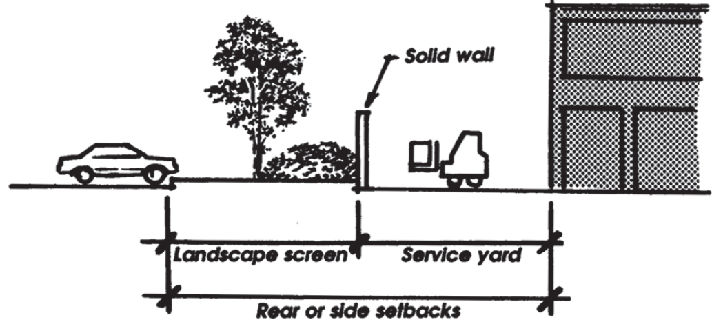 Loading doors shall be screened from public rights-of-way and residential uses or districts by the use of wing walls, screening walls, landscaping or any combination thereof approved by the reviewing authority (Figure 9.72.060-H).