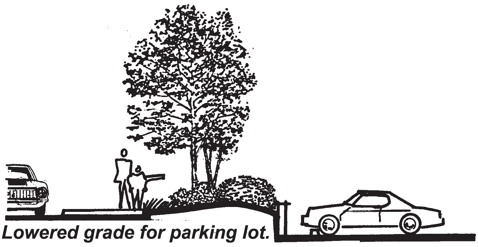 Low walls, berms or landscaping, thirty-six (36) to forty-two (42) inches in height, as measured from the finished grade of the parking area, shall be used adjacent to public rights-of-way to screen the parking area. The height of such wall or berm may be reduced where the parking lot grade is lowered (Figure 9.72.080-B).