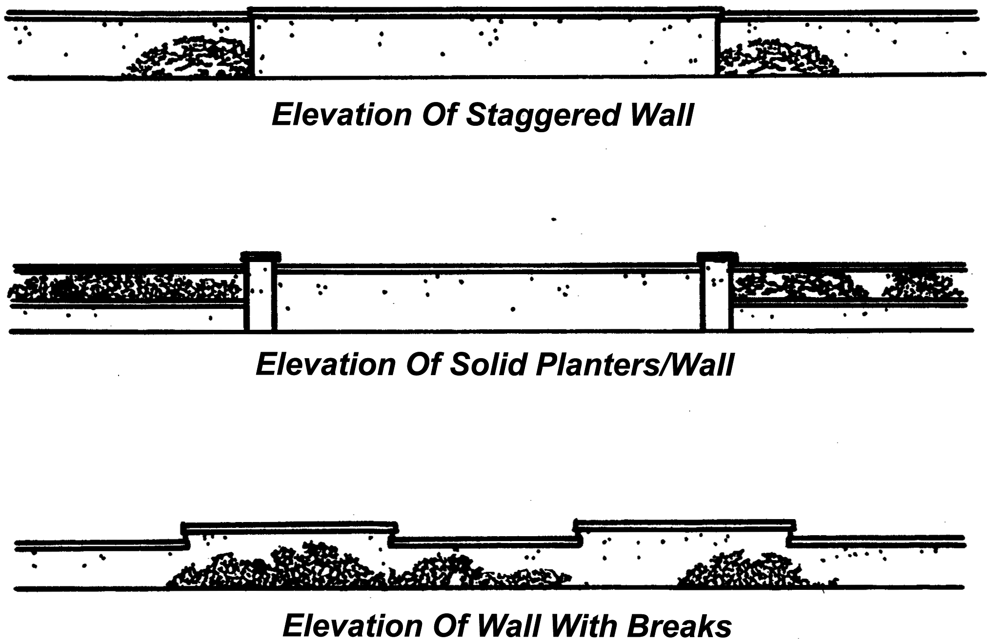Promote climate modifications for enhancement of pedestrian environment at street frontages, parking lots and building facades.