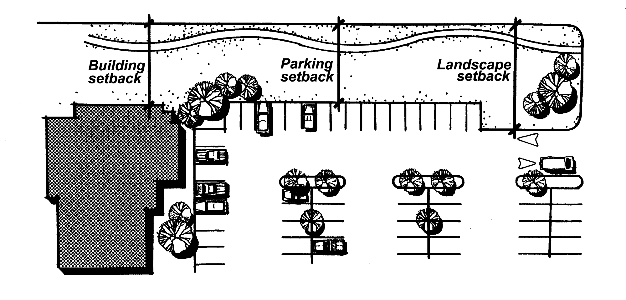 Provide visual screening of parking, service and storage areas.
