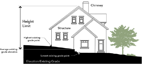 Structure Height. Structure height shall be measured from the average level of the highest and lowest existing grade elevation points of that portion of the site covered by the building, to the highest portion of the roof (excluding chimneys), except as otherwise specified by this Development Code. "Existing grade" shall be established by the Director, consistent with lots in the immediate vicinity. See Figure 3-1 (Measurement of Structure Height: Flat Ground Level and Slopes of Less than 20 Percent).