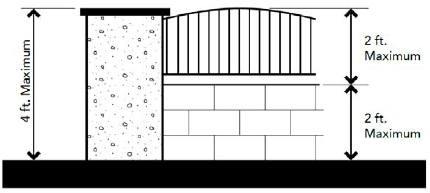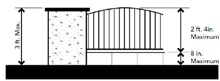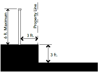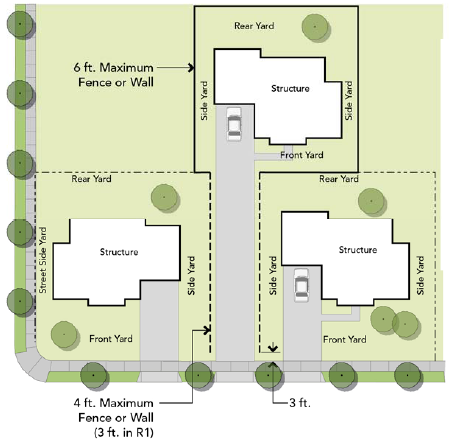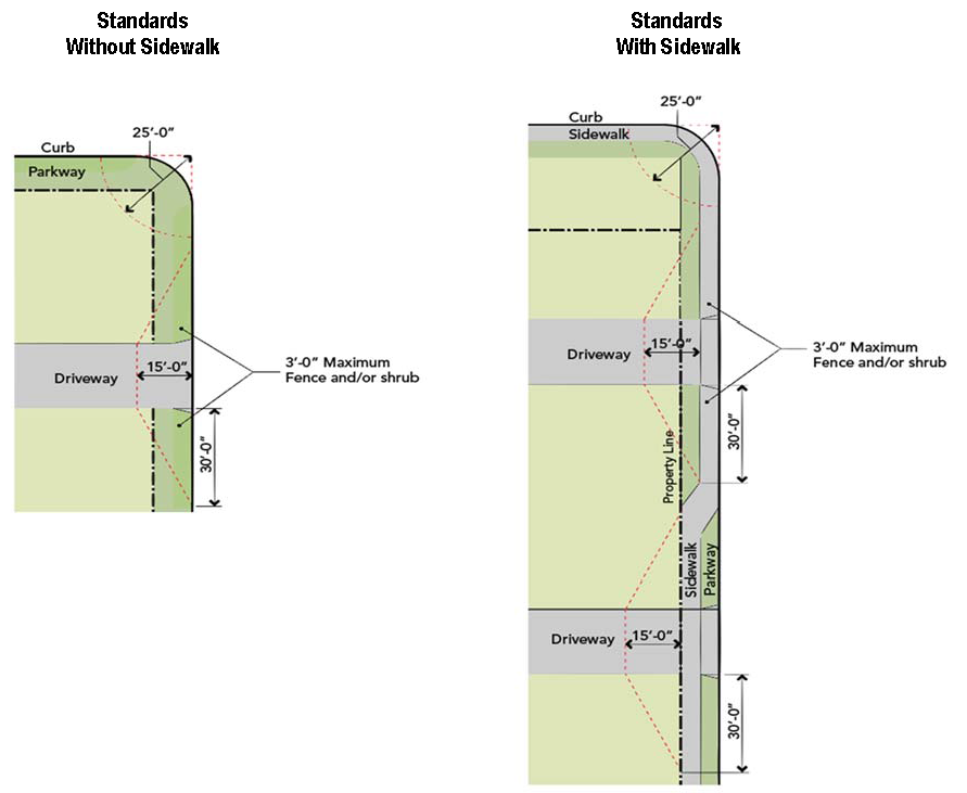 Vehicular Visibility Area Requirements. Within 25 feet of an intersection of a vehicular way with a vehicular and/or pedestrian way; no buildings, structures, fences, walls, shrubs, landscape, architectural features, or dense landscaping shall exceed a height of three feet as measured from the surface of the vehicular ways. See Figure 3-5 (Vehicular Visibility-Driveways and Intersections) for standards for lots with and without sidewalks.