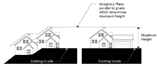 Structure Height on Slopes with 20 Percent Grade. For lots with an average slope of 20 percent or greater, structure height shall be measured from the adjacent existing grade to the topmost point of the roof (excluding chimneys), except as otherwise specified by this Development Code. The maximum allowable height shall be measured as the vertical distance from the existing grade of the site to an imaginary plane located the allowed number of feet above and parallel to the grade. "Existing grade" shall be established by the Director, consistent with lots in the immediate vicinity. See Figure 3-2 (Measurement of Structure Height: Slopes of 20 Percent of Greater).