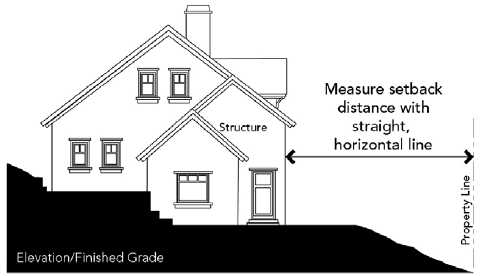 For sloped lots the measurement shall be made as a straight, horizontal line from the property line to the edge of the structure, not up or down the hill slope. See Figure 3-4 (Setback Measurement for Sloped Lots).