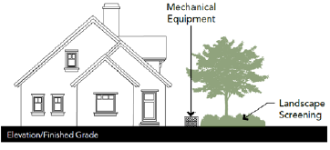 Mechanical equipment, including but not limited to heating and air conditioning devices, shall be located within the building or if mounted elsewhere, shall be screened from public view. Mechanical equipment on the ground or on the roof shall be screened from view from adjacent properties and the public right-of-way by an enclosure designed as part of the building or by appropriate landscaping. See Figure 3-6 (Equipment Screening).