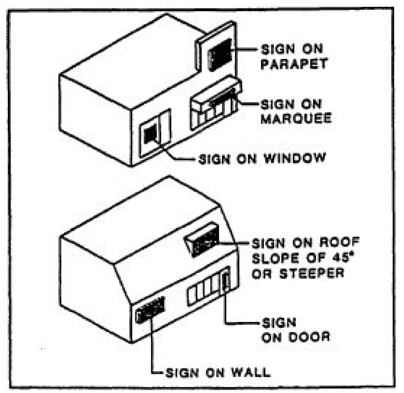 Building sign: means a type of permanent sign displayed upon or attached to any part of the exterior of a building, including walls, windows, doors, parapets, marquees, and roof slopes of 45 degrees or steeper. (See Figure below.)