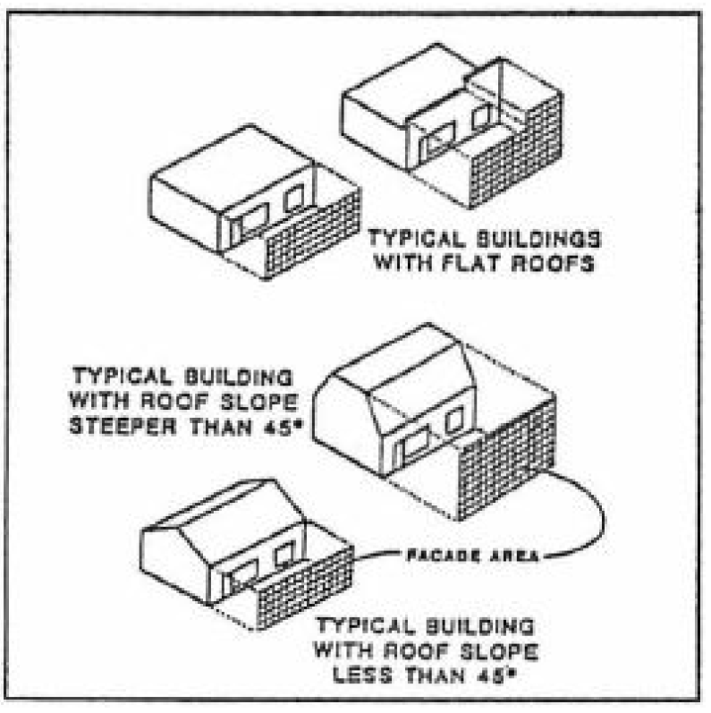 Façade area: means that area of a building within a two-dimensional geometric figure coinciding with the outer edges of the walls, windows, doors, parapets, marquees, and roof slopes greater than 45 degrees of a building which is owned by or under lease to a single occupant. (See Figure below.)