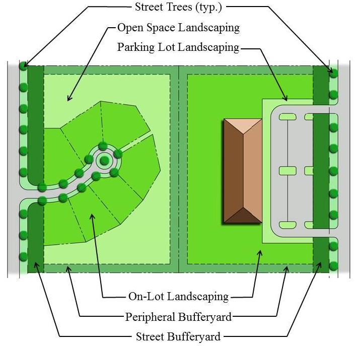 Figure 40.04.210 shows how a property is divided into planting areas for peripheral bufferyards, street bufferyards, on-lot landscaping, open space landscaping, street trees and parking lot landscaping.