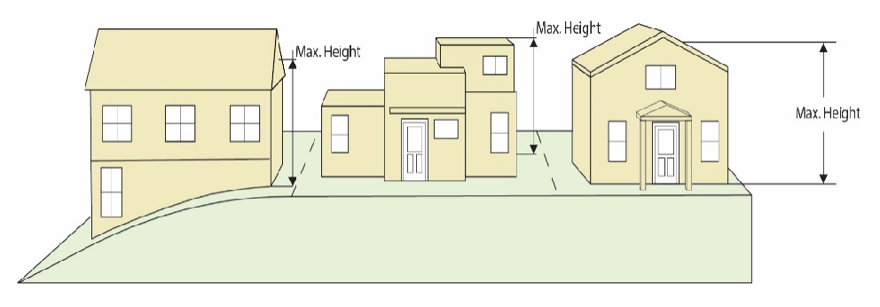 Building Height. Building height is measured as the vertical distance between the point of measurement on the ground to the highest point of: (1) to the deck line of a mansard roof; or (2) to the mid-point of the highest gable of a pitched or hip roof. The point of measurement may be taken from the highest adjoining sidewalk or ground surface within a five-foot horizontal distance along the exterior wall of the building.