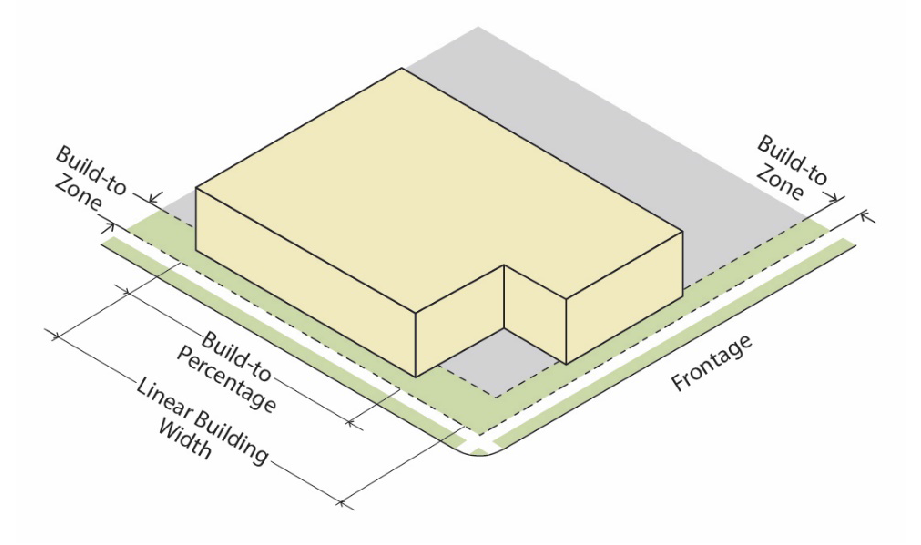 Street frontage is measured between side lot lines along the street lot line. Lots that do not have the required frontage at the street right-of-way line will indicate a building setback line by a dashed line at the point where the lot has the required width, but in no case less than the setback normally required.