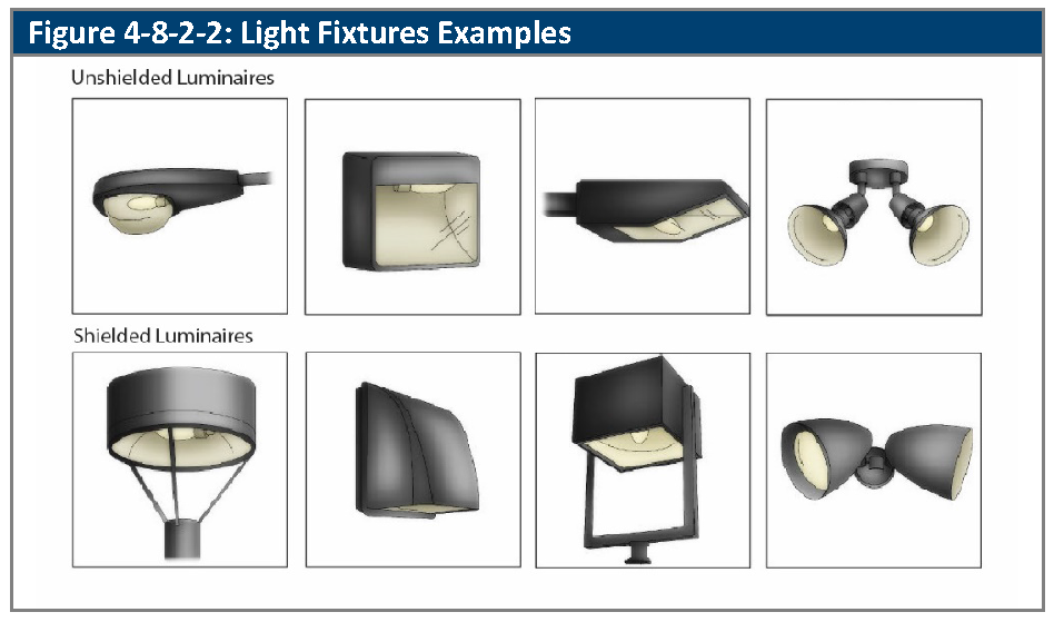 General Standards.Division 4-8-2. General Lighting Standards, provides general design standards for light fixtures, standards for different land use categories, outdoor recreation lighting standards, and standards for the lighting curfew.