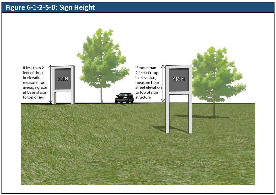 Sign Height. Sign height is the vertical distance to the top of the sign face or sign structure, whichever is higher, measured from the elevation of the average grade in the area within the required landscape area around the base of the sign. If said average grade is more than two feet lower than the average grade of the nearest abutting street (if two streets are equidistant, the higher of the two), then the height of the detached sign shall be measured from the elevation of said street to the top of the higher of the sign face or sign structure.