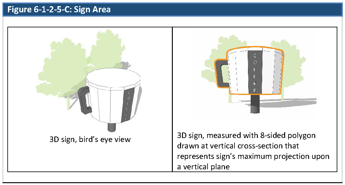 Free-standing and projecting signs may have multiple faces or contain three-dimensional objects. The area of such signs is measured using the vertical cross-section that represents the sign's maximum projection upon a vertical plane.