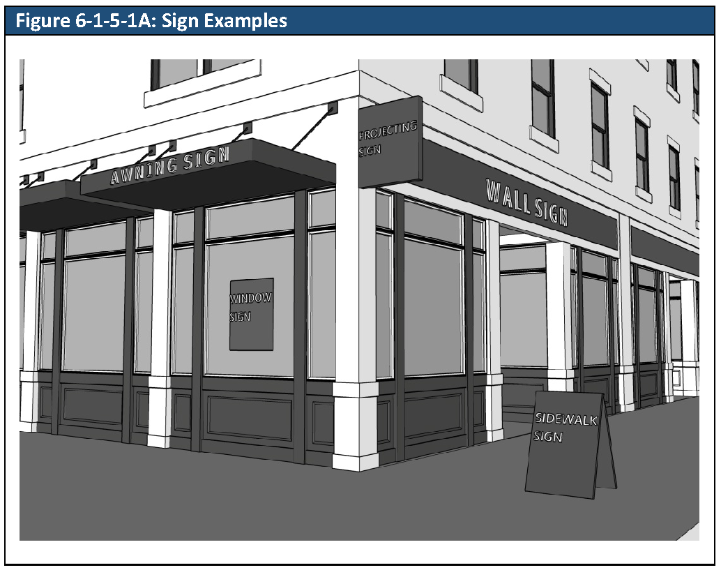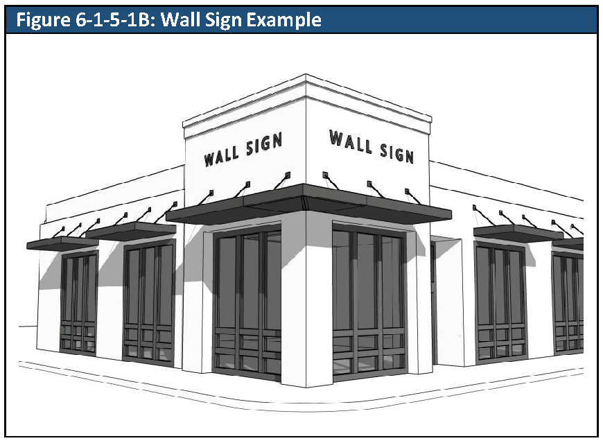 Wall Signs. Wall signs are allowed according to the standards in Table 6-1-5-1A, Wall Signs. The location of wall signs on a building is restricted by Subsection F. of Section 6-1-3-1F, Prohibited Signs and Sign Elements.