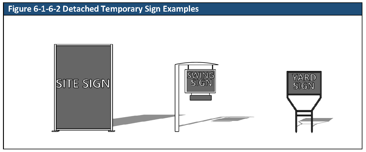 Detached Temporary Signs. Detached temporary signs are allowed according to the standards in Table 6-1-6-2, Detached Temporary Signs.