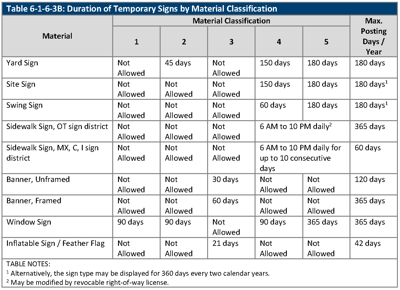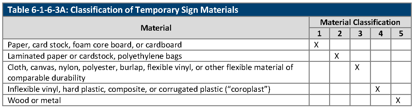 Classification of Temporary Sign Materials. Temporary signs are constructed from a variety of materials with varying degrees of durability. Common materials are classified in Table 6-1-6-3A, Classification of Temporary Sign Materials.