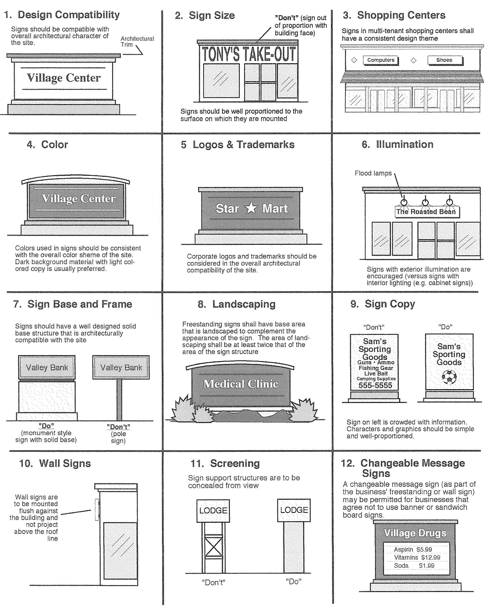 Sign Copy: Sign copy should be simple and concise without excessive description of services or products. On freestanding signs, sign copy should be designed to contribute to the design of the structure on which it is displayed. In all cases, freestanding sign design and sign copy should be coordinated to provide an attractively designed freestanding element which identities the development or project.