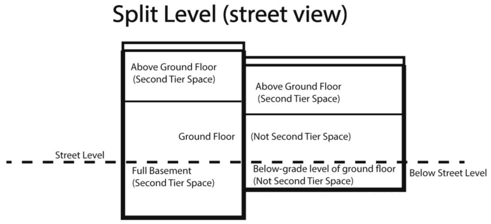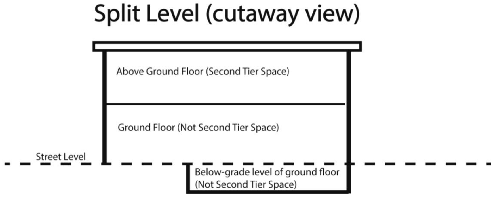 Split-level building. A structure or portion thereof, with floor levels separated from the adjacent sidewalk level by four (4) or more feet of both horizontal and vertical separation and which has a finished grade below the level of the sidewalk in the area between the building and the sidewalk.