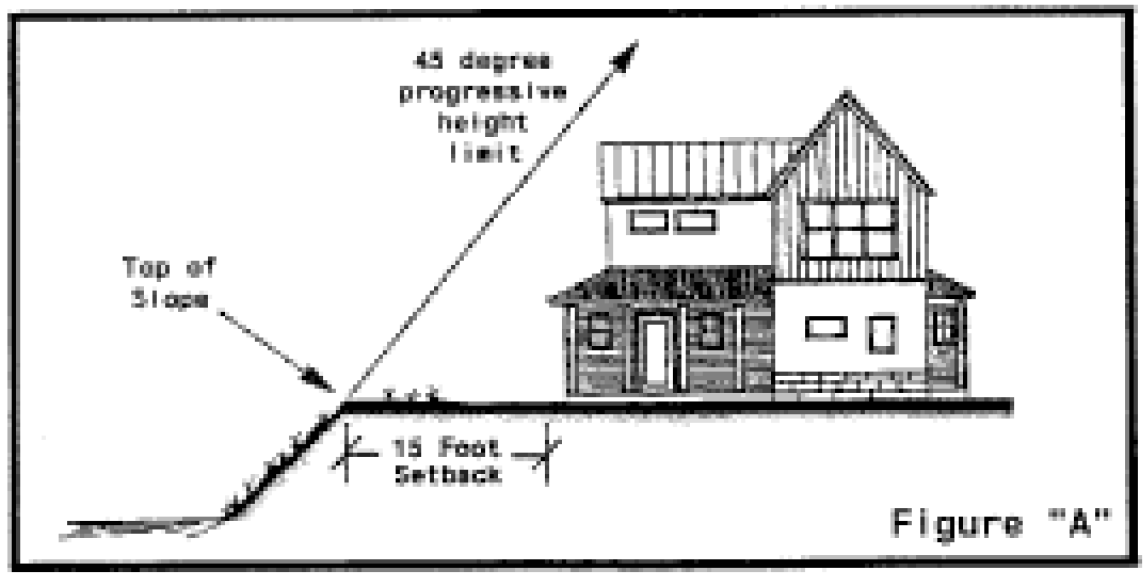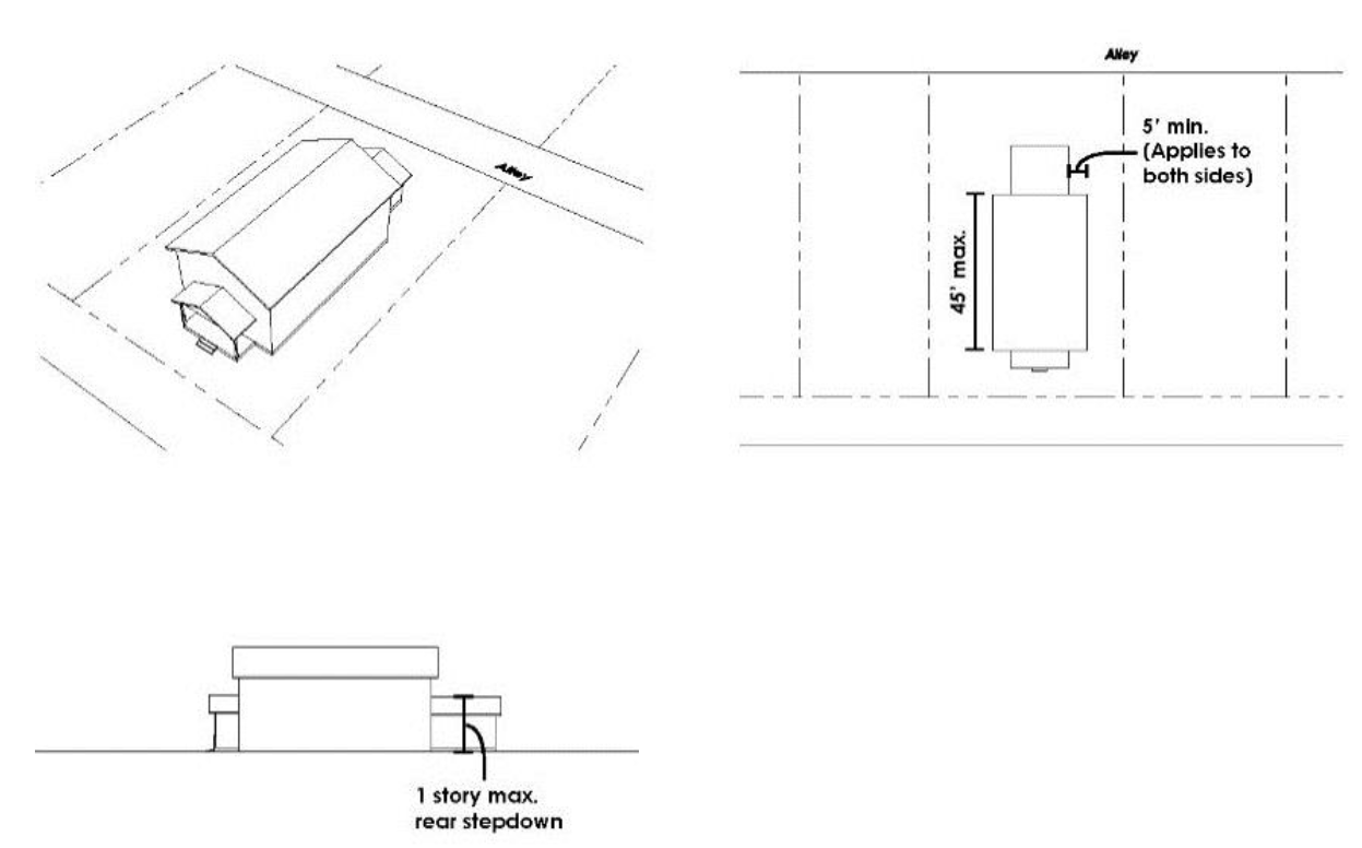 Increased Side Setbacks at Rear and Step Down. A principal building shall provide increased side setbacks at the rear of the building. If the principal building is two (2) stories, it shall step down to one story in the rear. The increased side setbacks and one story step down shall occur at a maximum of forty-five (45) feet, as measured from the front-most wall toward the rear wall. The increased side setbacks shall be at least five (5) feet greater than the side setbacks at the front of the building. See Figure 7.