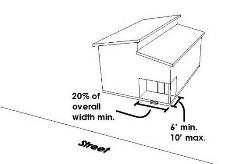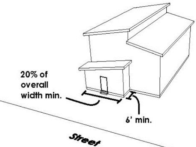 Projecting One-Story Element. The front façade of the principal building shall have a one-story street-facing element that projects at least six (6) feet from the front façade and has a width equivalent to at least twenty percent (20%) of the building's (or unit's) overall width. This one story element may be enclosed living space or a front porch that is open on three (3) sides. This one story element shall be a minimum of 50 square feet in area. Accessible space (whether it is a deck, porch or enclosed area) shall not be allowed over the first story element; however, accessible space over the remaining first story elements on the front façade shall not be precluded. See Figure 10.