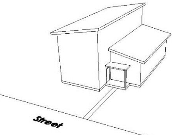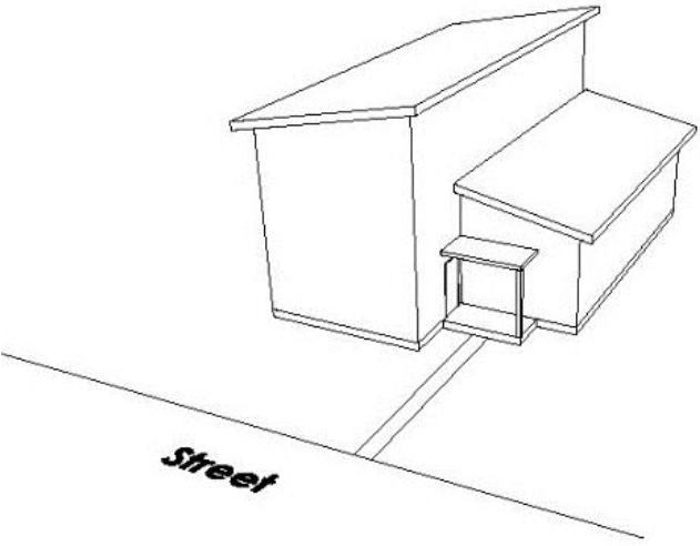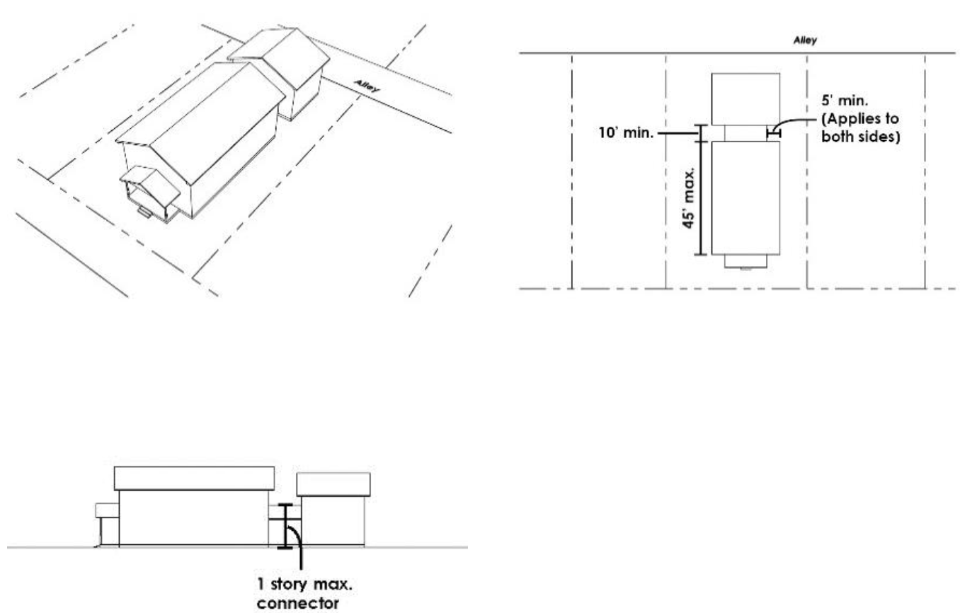 Off-set with One-Story Ground Level Connector. A principal building shall provide a portion of its mass as a subordinate one-story, ground floor connecting element. The connecting element shall be at least ten (10) feet in length and shall be setback at least an additional five (5) feet from the sidewall on both sides of the building. The connecting element shall occur at a maximum of forty-five (45) feet in depth, as measured from the front-most wall of the front façade to the rear wall. Accessible outdoor space over the connecting element (e.g. a deck) is permitted but may not be covered or enclosed. Any railing for an accessible outdoor space over a connecting element must be the minimum reasonably necessary to provide adequate safety and building code compliance and the railing must be fifty percent (50%) or more transparent. See Figure 6.
