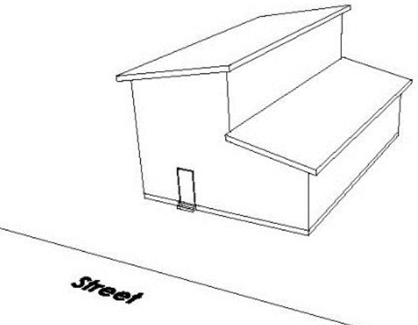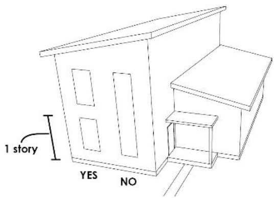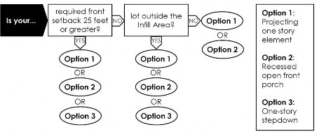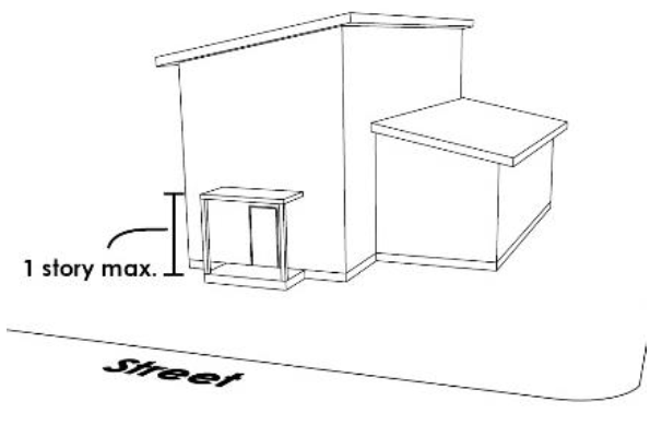 Standard. A principal building shall incorporate a one-story element on the front façade. Duplexes in a side-by-side configuration are required to have a one-story element per dwelling unit.