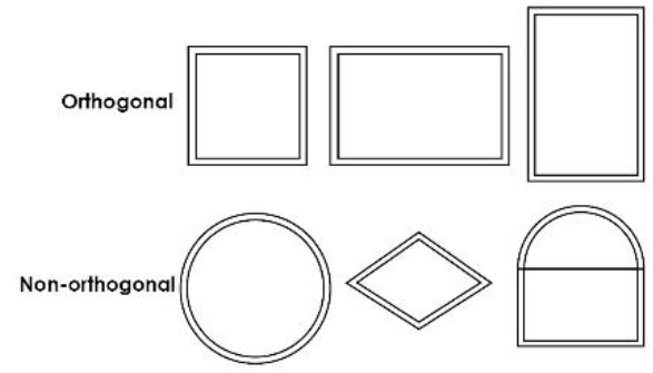 Non-orthogonal Window. A window with an opening that is not rectangular in nature and does not possess right angles at each of its four (4) corners and vertical or horizontal orientation of all edges.