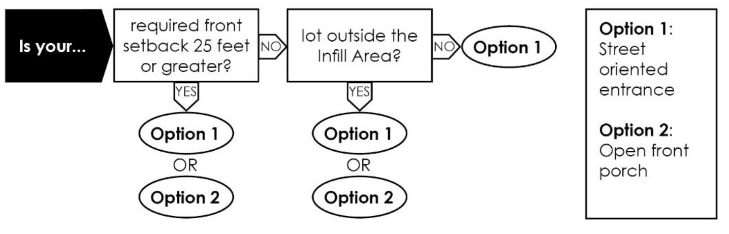 Intent. This standard seeks to establish a relationship between buildings and streets to create an engaging streetscape and discourage the isolation of homes from the surrounding neighborhood. The placement of buildings should seek to frame street edges physically or visually. Buildings should be oriented in a manner such that they are a component of the streetscape, which consists of the street itself and the buildings that surround it. Building orientation should provide a sense of interest and promote interaction between buildings and passersby. Building orientation is important in all areas of the city, but is particularly important in the Infill Area where there is a strong pattern of buildings that are parallel to the street. Designs should prioritize the visibility of the front façade from the street by designing the majority of the front façade to be parallel to the street or prominently visible from the street. Front facades, porches, driveways, windows, and doors can all be designed to have a strong and direct relationship to the street.