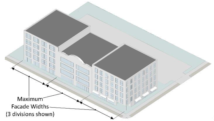 Street-facing façade widths. These building massing standards apply to building types which include a street- facing façade width requirement. When required, buildings must use one of the following to divide the façade into the maximum street-facing width divisions shown for the building type in section 16-20V.015(9) through section 16-20V.015(17), as measured along the base of the façade: