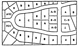 D = reversed frontage lot, defined as a lot on which the frontage is at right angles or approximately right angles (interior angle less than 135 degrees) to the general pattern in the area. A reversed frontage lot may also be a corner lot (A-D); an interior lot (B-D), or a through lot (C-D).