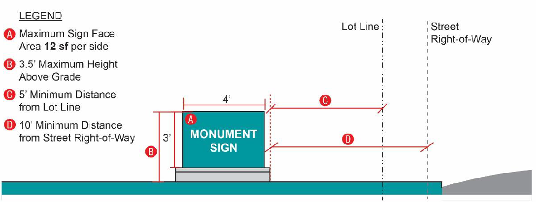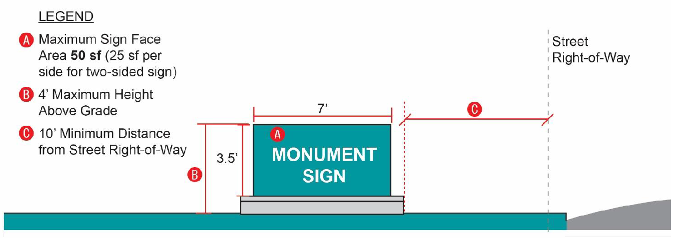Up to one (1) ground-mounted or monument sign per entrance may be utilized, provided it does not exceed twenty (20) square feet in face area, and seven (7) feet in height.