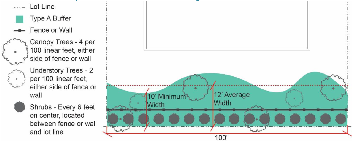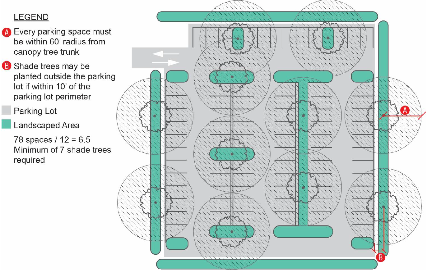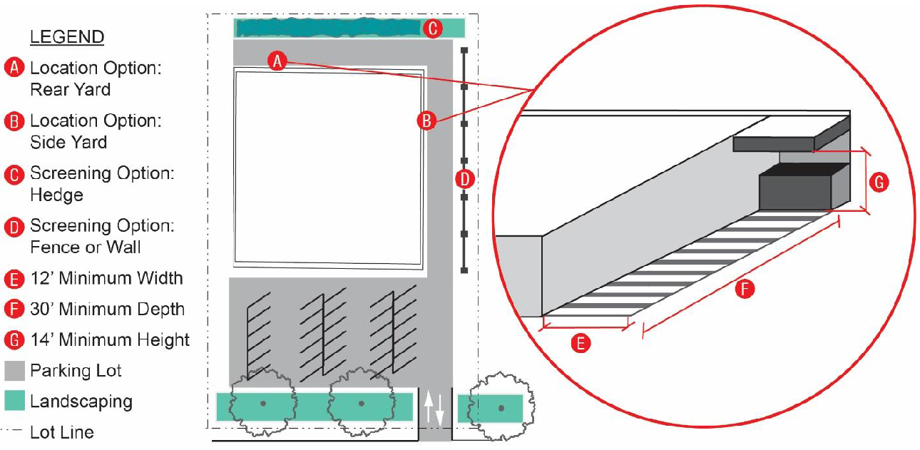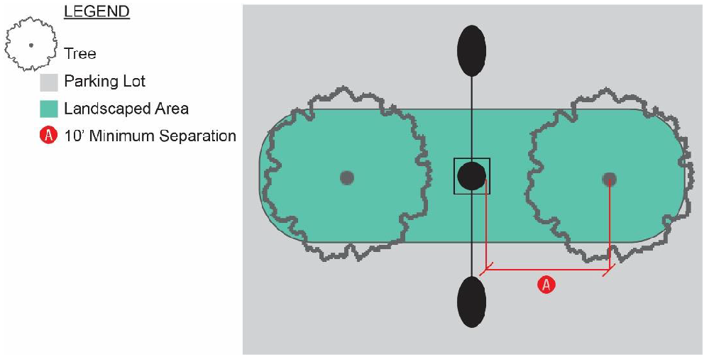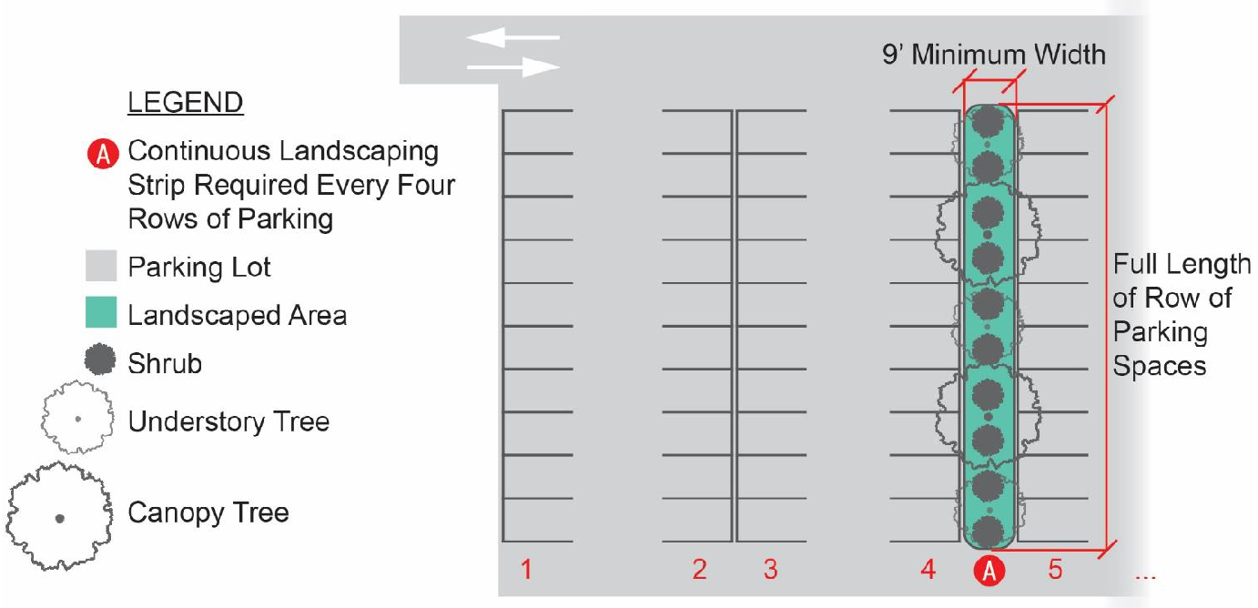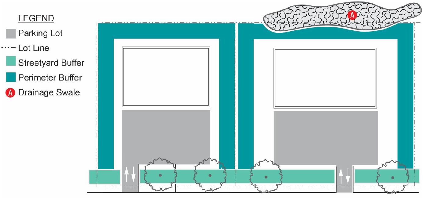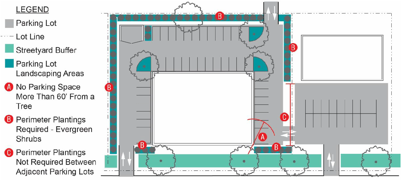 No surface parking or circulation driveway is permitted within any required landscaping area, but driveways may be installed across these areas.