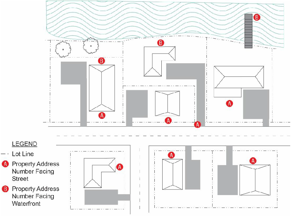 All structures located on the waterfront (including the sound, oceanfront, and canals) shall display property address numbers on the waterfront side of the property in addition to the street side.