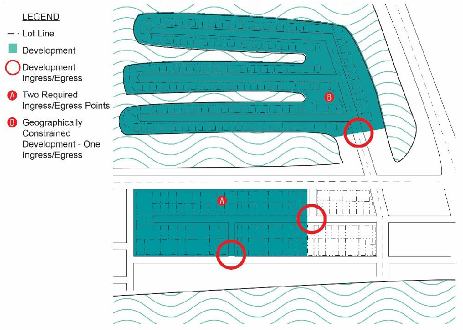 Minimum Points of Access. Any development of more than one hundred (100) residential units, or additions to existing developments that result in the total number of units exceeding one hundred (100) shall be required to provide vehicular access to at least two (2) public streets, unless deemed impractical by the UDO Administrator due to topography, natural features, or the configuration of adjacent developments (see Figure 18.5.2.C.2: Minimum Points of Access).