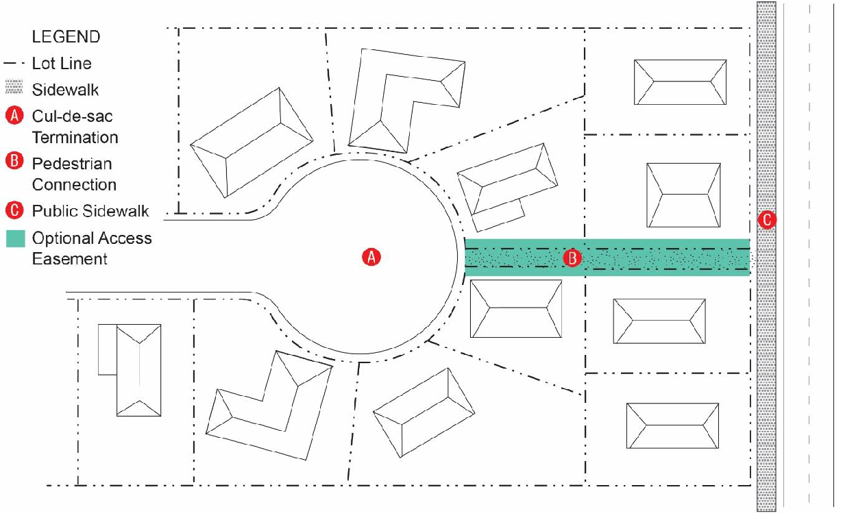 Unless determined impractical by the UDO Administrator, residential developments with cul-de-sacs or dead-end streets shall include a sidewalk or multi-use path from the dead end or cul-de-sac to the closest local street, collector street, or to a cul-de-sac in an adjoining subdivision.