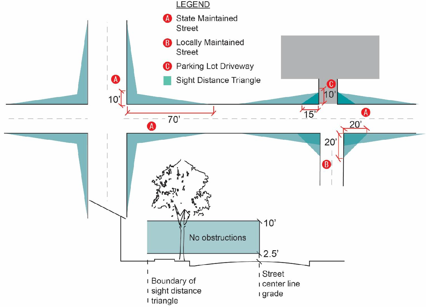 In cases where a roadway intersects a state-maintained roadway, the required sight distance triangle shall be an area between a point at the edge of the state-maintained road right-of-way located seventy (70) linear feet from the intersection and a second point at the edge of the opposing road right-of-way located ten (10) feet from the intersection.