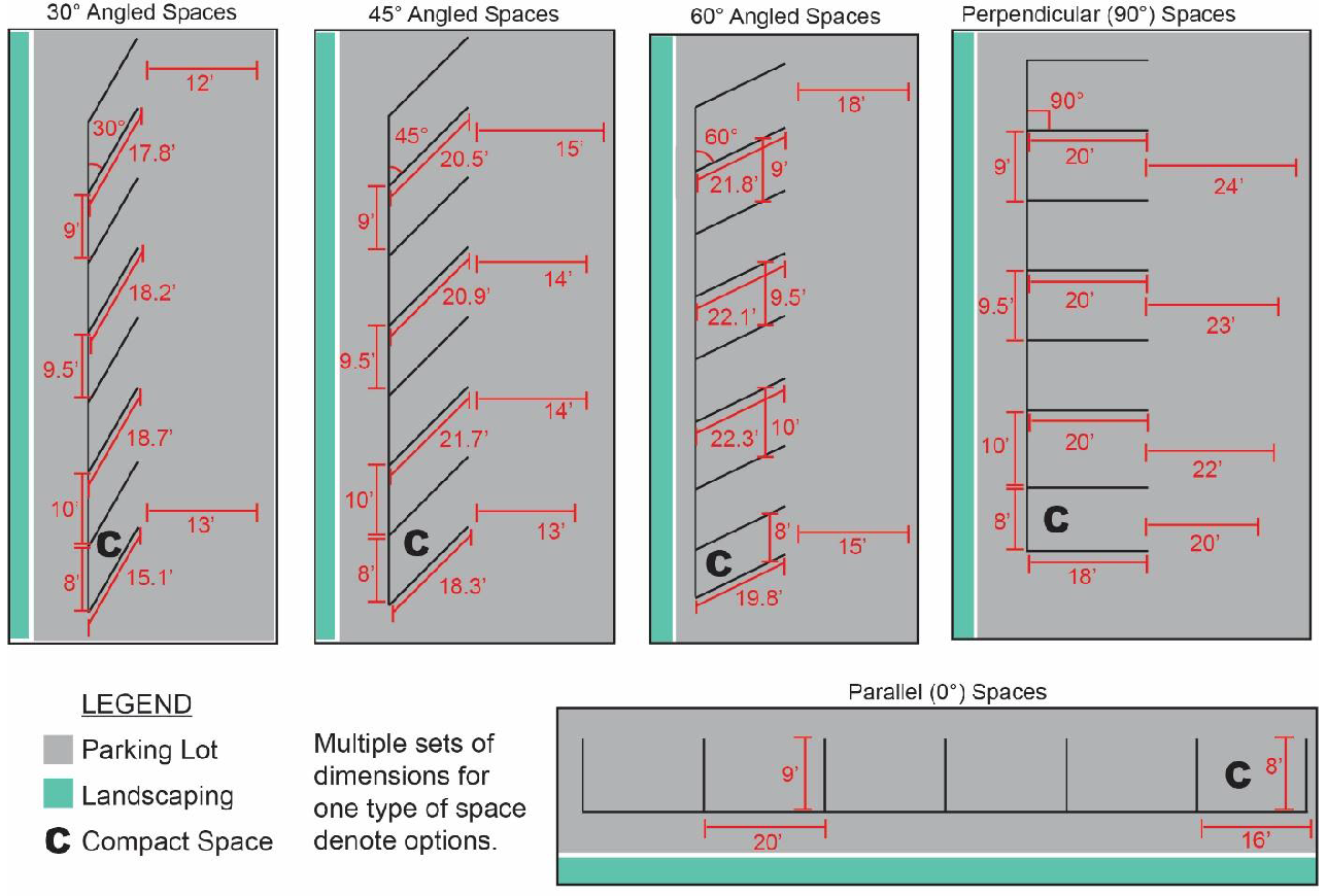 Points of Ingress or Egress on a Roadway. Lots with a driveway serving a parking lot of four (4) or more off-street parking spaces shall incorporate a sight distance triangle that includes an area between one (1) point at the edge of the road right-of-way located fifteen (15) feet from the edge of the driveway and a second point at the edge of the driveway located ten (10) feet from the edge of the road right-of-way.