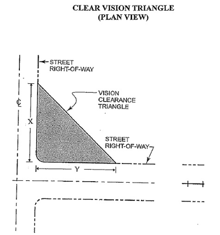CLEAR VISION TRIANGLE. The required clear cross-visibility area unobstructed by any sign structure between 36 inches and 7 feet above the surface of the public sidewalk as follows: