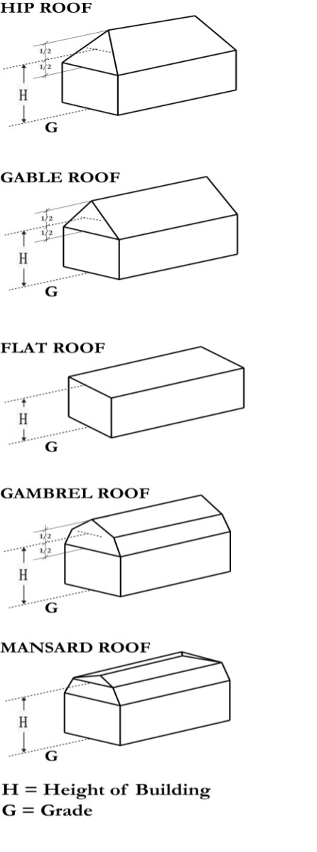 Building Height: The vertical distance measured from the sidewalk level or its equivalent established grade opposite the middle of the front of the building to the highest point of the roof in the case of a flat roof; to the deck line of a mansard roof; and to the mean height level between eaves and ridge of a gable, hip or gambrel roof; provided, that where buildings are set back from the street line, the height of the building may be measured from the average elevation of the finished lot grade at the front of the building.
